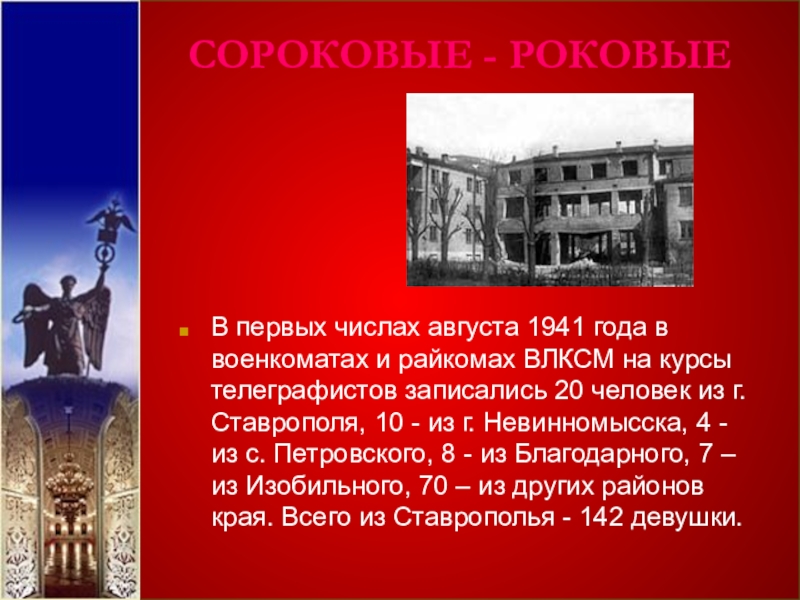 августа 1941 года в военкоматах и райкомах ВЛКСМ на курсы телеграфистов записались 20 человек из г. Ставрополя, 10 - из г. Невинномысска, 4 - из с. Петровского, 8 - из Благодарного, 7 –из Изобильного, 70 – из других районов края. Всего из Ставрополья - 142 девушки.