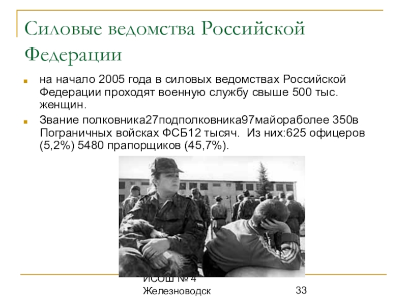 2005 года в силовых ведомствах Российской Федерации проходят военную службу свыше 500 тыс. женщин.