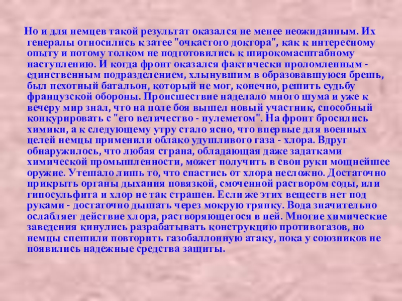 менее неожиданным. Их генералы относились к затее "очкастого доктора", как к интересному опыту и потому толком не подготовились к широкомасштабному наступлению. И когда фронт оказался фактически проломленным - единственным подразделением, хлынувшим в образовавшуюся брешь, был пехотный батальон, который не мог, конечно, решить судьбу французской обороны. Происшествие наделало много шума и уже к вечеру мир знал, что на поле боя вышел новый участник, способный конкурировать с "его величество - пулеметом". На фронт бросились химики, а к следующему утру стало ясно, что впервые для военных целей немцы применили облако удушливого газа - хлора. Вдруг обнаружилось, что любая страна, обладающая даже задатками химической промышленности, может получить в свои руки мощнейшее оружие. Утешало лишь то, что спастись от хлора несложно. Достаточно прикрыть органы дыхания повязкой, смоченной раствором соды, или гипосульфита и хлор не так страшен. Если же этих веществ нет под руками - достаточно дышать через мокрую тряпку. Вода значительно ослабляет действие хлора, растворяющегося в ней. Многие химические заведения кинулись разрабатывать конструкцию противогазов, но немцы спешили повторить газобаллонную атаку, пока у союзников не появились надежные средства защиты.