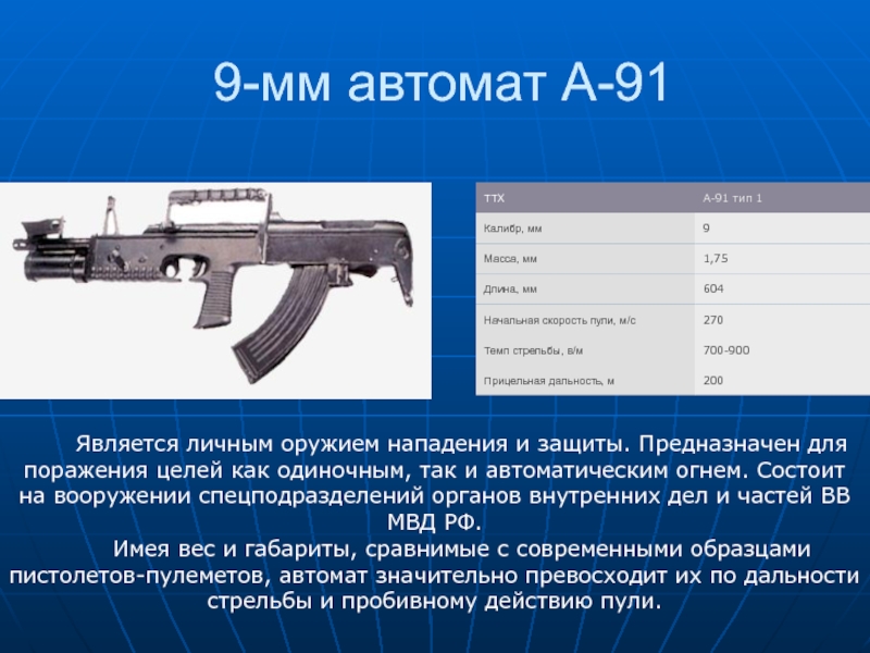 поражения целей как одиночным, так и автоматическим огнем. Состоит на вооружении спецподразделений органов внутренних дел и частей ВВ МВД РФ.
