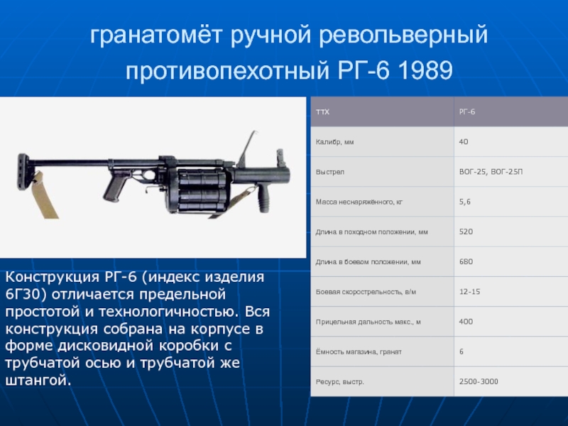 Слайд 37гранатомёт ручной револьверный противопехотный РГ-6 1989
