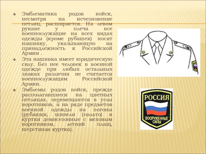 Слайд 19Эмблематика родов войск, несмотря на исчезновение петлиц, расширяется. На левом рукаве