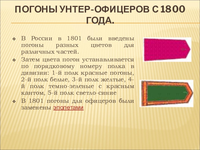 Слайд 7ПОГОНЫ УНТЕР-ОФИЦЕРОВ С 1800 ГОДА.