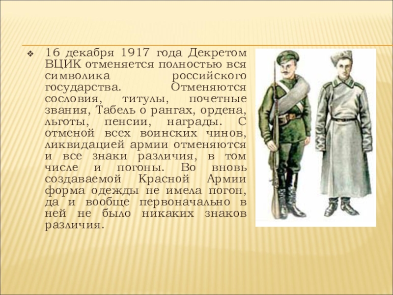 государства. Отменяются сословия, титулы, почетные звания, Табель о рангах, ордена, льготы, пенсии, награды. С отменой всех воинских чинов, ликвидацией армии отменяются и все знаки различия, в том числе и погоны. Во вновь создаваемой Красной Армии форма одежды не имела погон, да и вообще первоначально в ней не было никаких знаков различия.