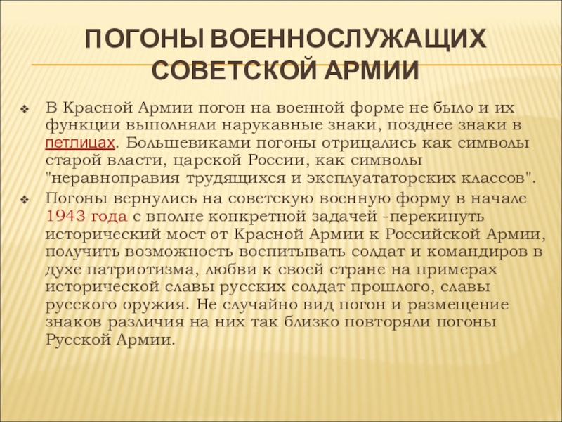 Погоны вернулись на советскую военную форму в начале 1943 года с вполне конкретной задачей -перекинуть исторический мост от Красной Армии к Российской Армии, получить возможность воспитывать солдат и командиров в духе патриотизма, любви к своей стране на примерах исторической славы русских солдат прошлого, славы русского оружия. Не случайно вид погон и размещение знаков различия на них так близко повторяли погоны Русской Армии.