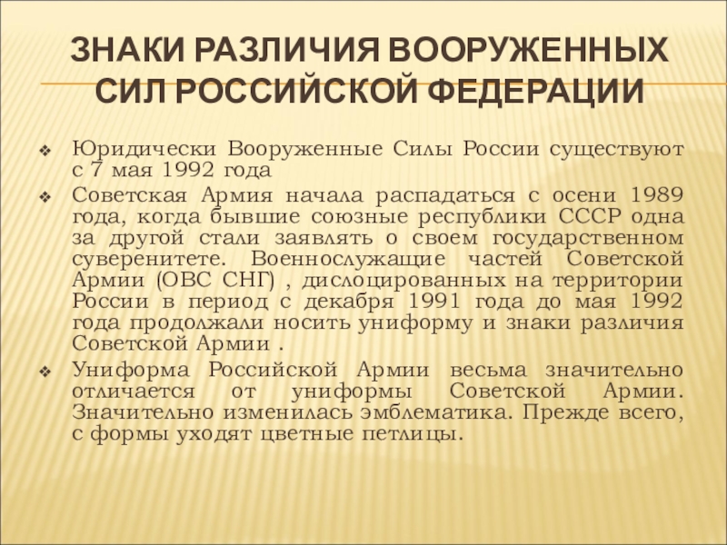 Советская Армия начала распадаться с осени 1989 года, когда бывшие союзные республики СССР одна за другой стали заявлять о своем государственном суверенитете. Военнослужащие частей Советской Армии (ОВС СНГ) , дислоцированных на территории России в период с декабря 1991 года до мая 1992 года продолжали носить униформу и знаки различия Советской Армии .
