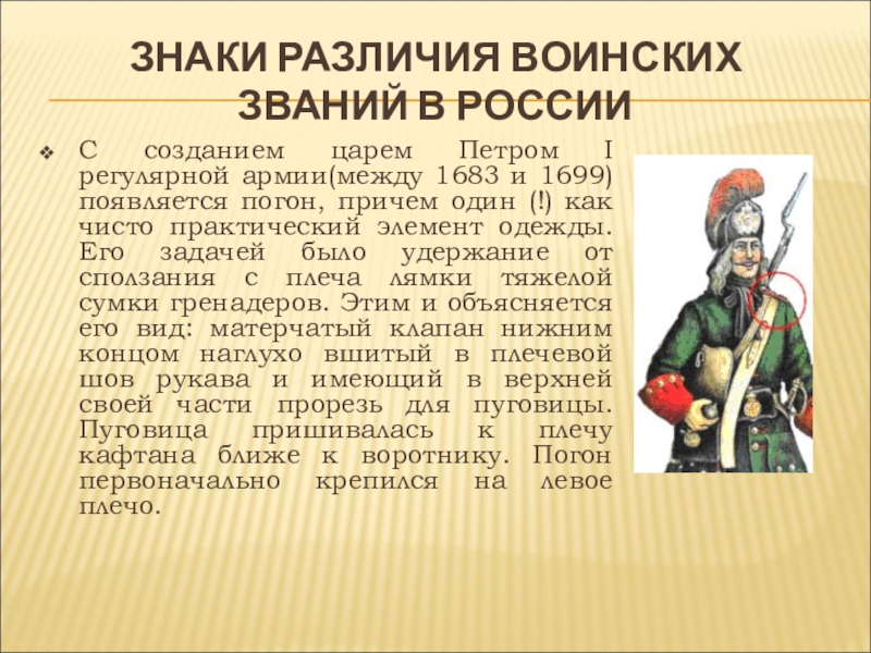 армии(между 1683 и 1699) появляется погон, причем один (!) как чисто практический элемент одежды. Его задачей было удержание от сползания с плеча лямки тяжелой сумки гренадеров. Этим и объясняется его вид: матерчатый клапан нижним концом наглухо вшитый в плечевой шов рукава и имеющий в верхней своей части прорезь для пуговицы. Пуговица пришивалась к плечу кафтана ближе к воротнику. Погон первоначально крепился на левое плечо.