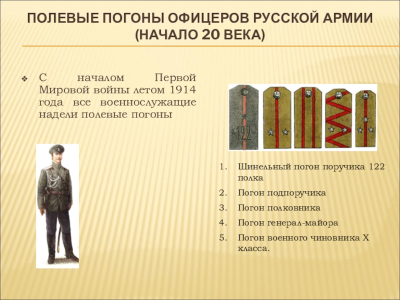 Слайд 10ПОЛЕВЫЕ ПОГОНЫ ОФИЦЕРОВ РУССКОЙ АРМИИ