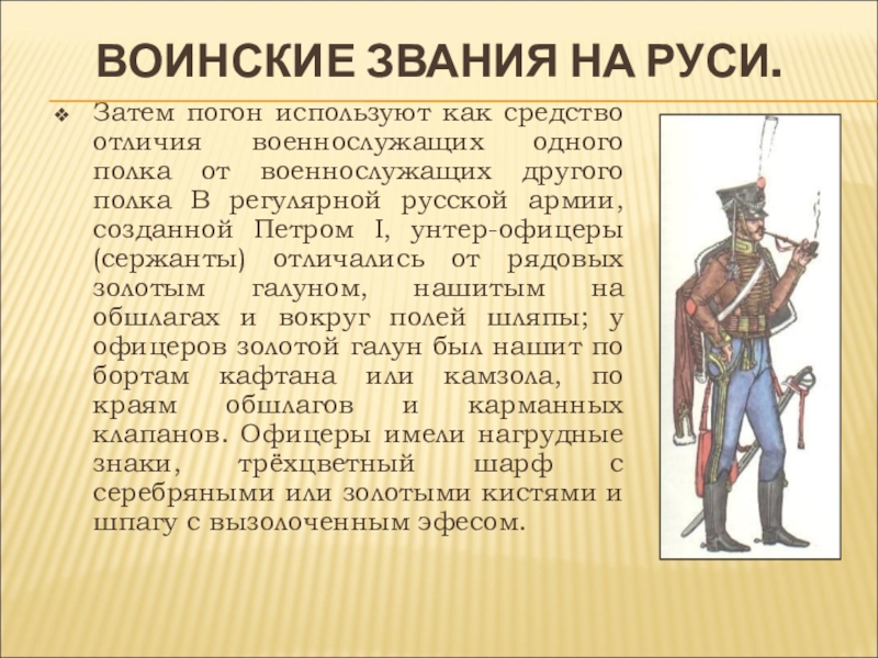 полка от военнослужащих другого полка В регулярной русской армии, созданной Петром I, унтер-офицеры (сержанты) отличались от рядовых золотым галуном, нашитым на обшлагах и вокруг полей шляпы; у офицеров золотой галун был нашит по бортам кафтана или камзола, по краям обшлагов и карманных клапанов. Офицеры имели нагрудные знаки, трёхцветный шарф с серебряными или золотыми кистями и шпагу с вызолоченным эфесом.