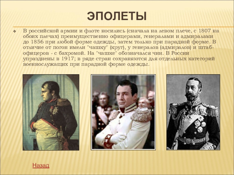 1807 на обоих плечах) преимущественно офицерами, генералами и адмиралами до 1856 при любой форме одежды, затем только при парадной форме. В отличие от погон имели "чашку" (круг), у генералов (адмиралов) и штаб-офицеров - с бахромой. На "чашке" обозначался чин. В России упразднены в 1917; в ряде стран сохраняются для отдельных категорий военнослужащих при парадной форме одежды.