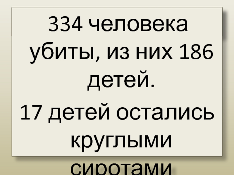 334 человека убиты, из них 186 детей.17 детей остались круглыми сиротами