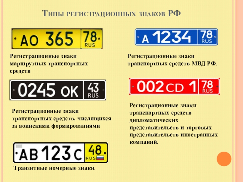 Регистрационные знаки транспортных средств дипломатических представительств и торговых представительств иностранных компаний.