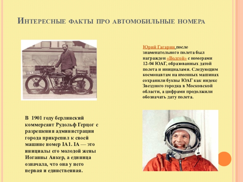 Юрий Гагарин после знаменательного полета был награжден «Волгой» с номерами 12-04 ЮАГ, образованных датой полета и инициалами. Следующим космонавтам на именных машинах сохранили буквы ЮАГ как индекс Звездного городка в Московской области, а цифрами продолжили обозначать дату полета.