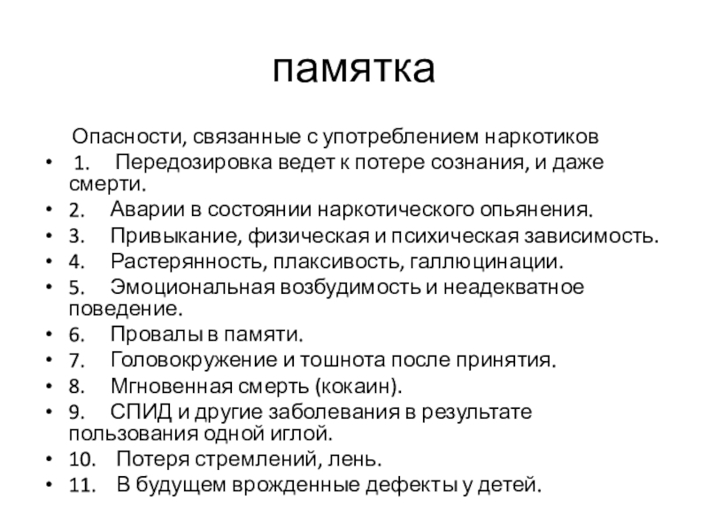 памятка      Опасности, связанные с употреблением наркотиков 1.     Передозировка ведет к потере сознания, и даже смерти.2.     Аварии в состоянии