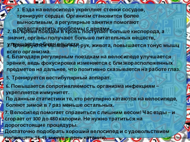 1. Езда на велосипеде укрепляет стенки сосудов, тренирует сердце. Организм становится более выносливым, а регулярные занятия помогают предотвратить проблемы с венами.
