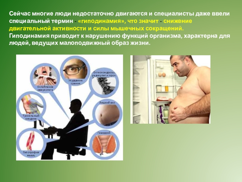 Слайд 3Сейчас многие люди недостаточно двигаются и специалисты даже ввели специальный термин