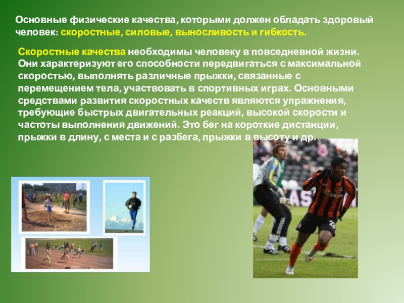 Слайд 5Основные физические качества, которыми должен обладать здоровый человек: скоростные, силовые, выносливость
