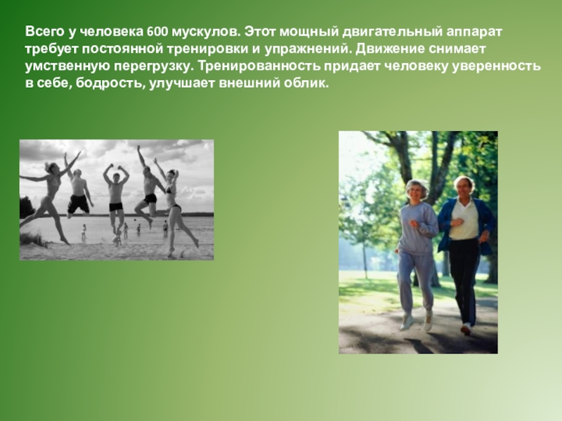 Слайд 4Всего у человека 600 мускулов. Этот мощный двигательный аппарат требует постоянной