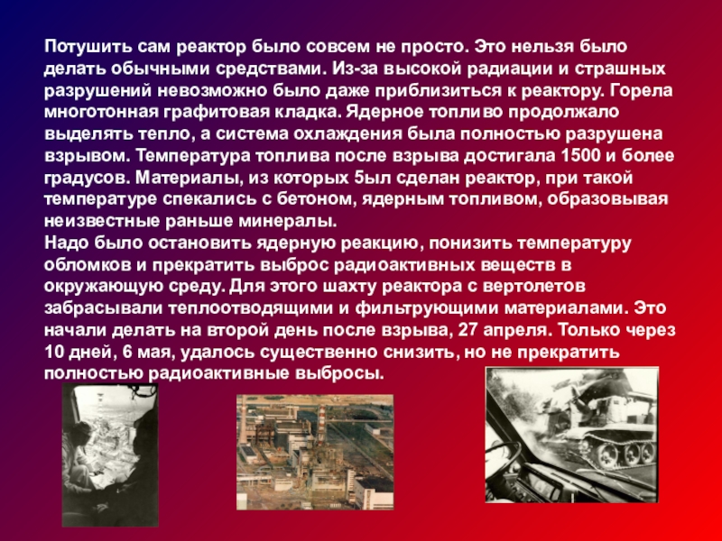 Слайд 5Потушить сам реактор было совсем не просто. Это нельзя было делать