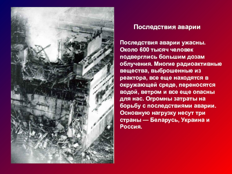 облучения. Многие радиоактивные вещества, выброшенные из реактора, все еще находятся в окружающей среде, переносятся водой, ветром и все еще опасны для нас. Огромны затраты на борьбу с последствиями аварии. Основную нагрузку несут три страны — Беларусь, Украина и Россия.