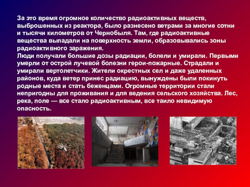 разнесено ветрами за многие сотни и тысячи километров от Чернобыля. Там, где радиоактивные вещества выпадали на поверхность земли, образовывались зоны радиоактивного заражения.