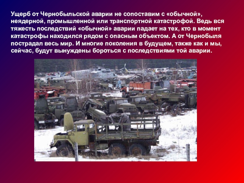 Слайд 8Ущерб от Чернобыльской аварии не сопоставим с «обычной», неядерной, промышленной или