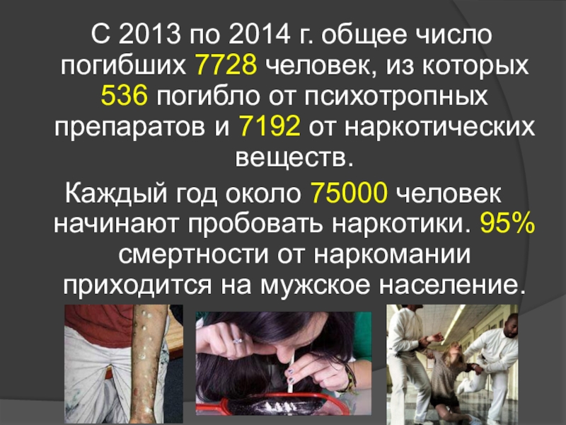 Каждый год около 75000 человек начинают пробовать наркотики. 95% смертности от наркомании приходится на мужское население.