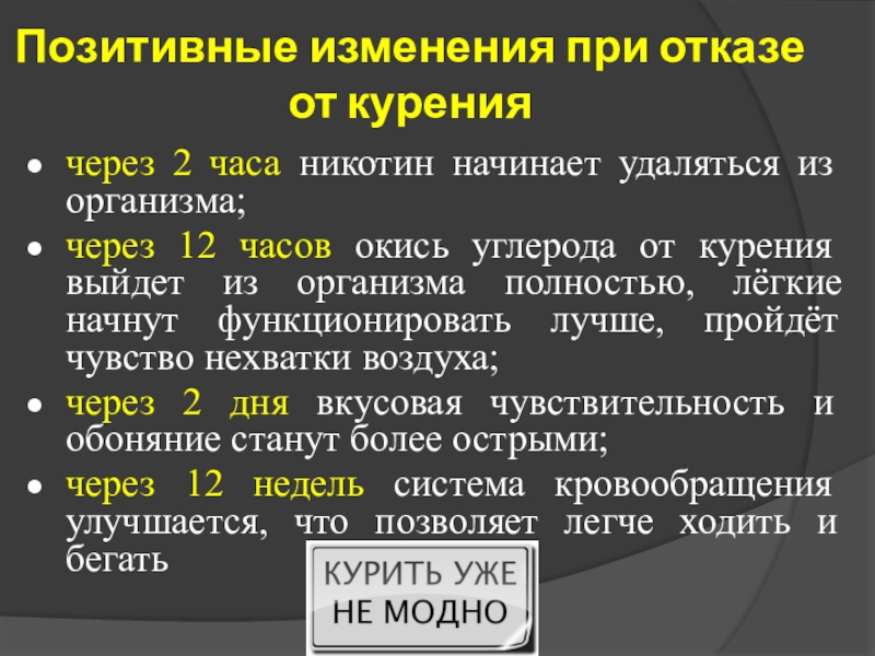 через 12 часов окись углерода от курения выйдет из организма полностью, лёгкие начнут функционировать лучше, пройдёт чувство нехватки воздуха;