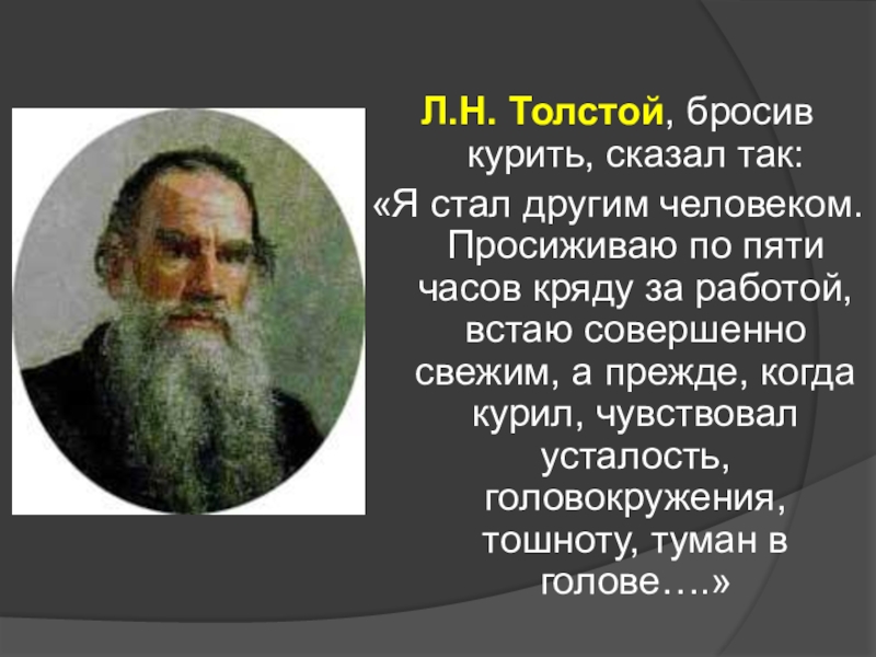 Слайд 7Л.Н. Толстой, бросив курить, сказал так: