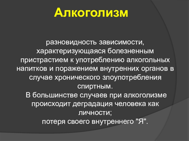 разновидность зависимости, характеризующаяся болезненным пристрастием к употреблению алкогольных напитков и поражением