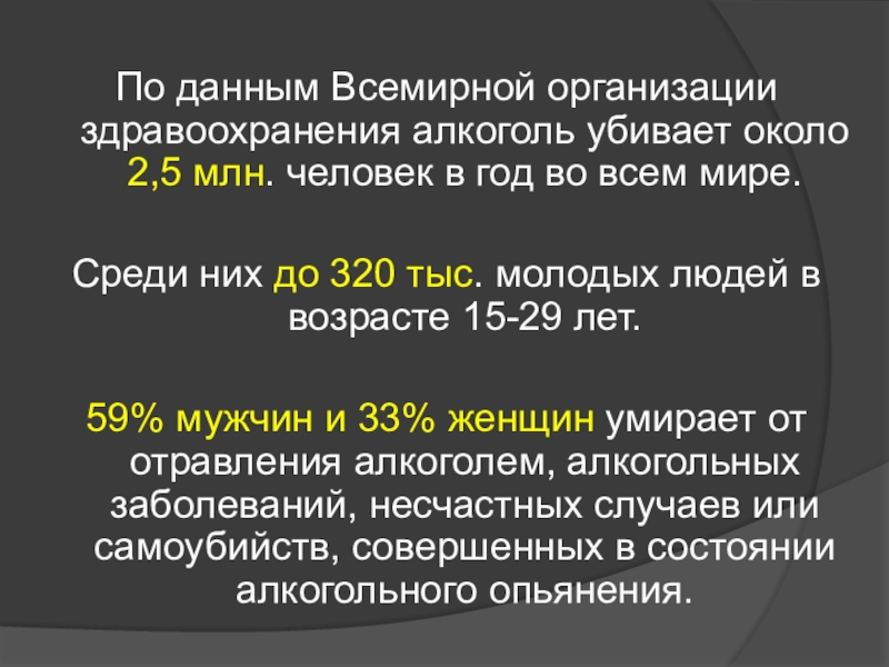По данным Всемирной организации здравоохранения алкоголь убивает около 2,5 млн. человек