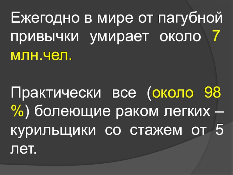 Слайд 9Ежегодно в мире от пагубной привычки умирает около 7 млн.чел.