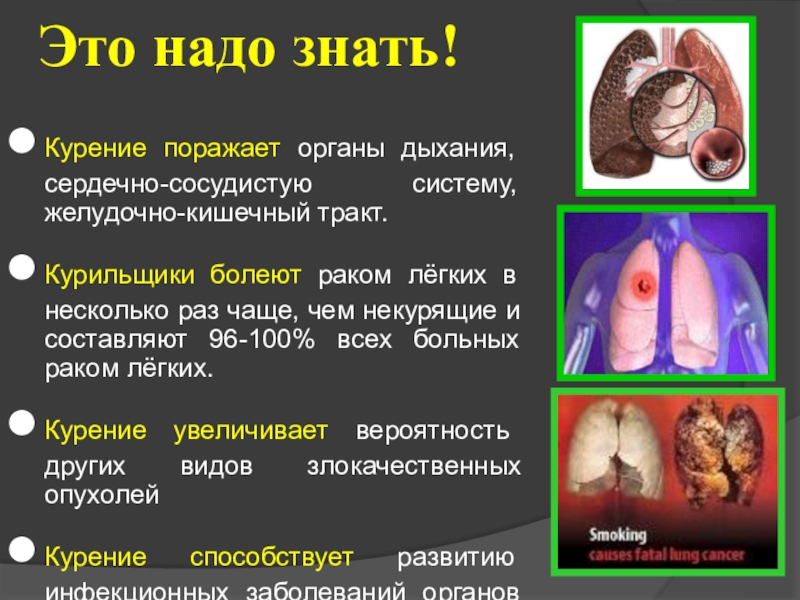 Курение поражает органы дыхания, сердечно-сосудистую систему, желудочно-кишечный тракт.