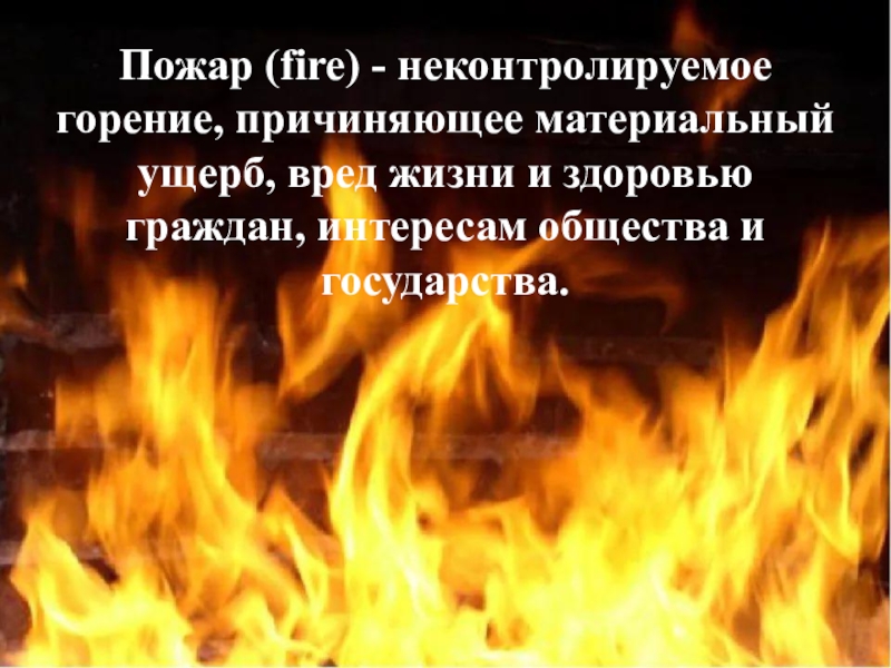 Пожар (fire) - неконтролируемое горение, причиняющее материальный ущерб, вред жизни и здоровью граждан, интересам общества и государства.