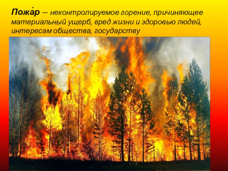 Слайд 2Пожа́р — неконтролируемое горение, причиняющее материальный ущерб, вред жизни и здоровью людей, интересам