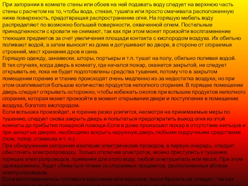 Слайд 12При загорании в комнате стены или обоев на ней подавать воду