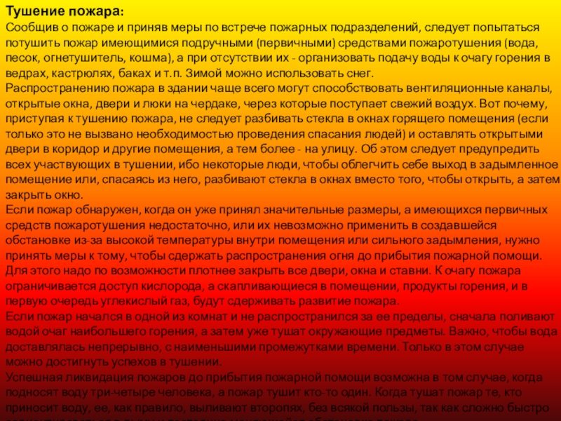 Если пожар обнаружен, когда он уже принял значительные размеры, а имеющихся первичных средств пожаротушения недостаточно, или их невозможно применить в создавшейся обстановке из-за высокой температуры внутри помещения или сильного задымления, нужно принять меры к тому, чтобы сдержать распространения огня до прибытия пожарной помощи. Для этого надо по возможности плотнее закрыть все двери, окна и ставни. К очагу пожара ограничивается доступ кислорода, а скапливающиеся в помещении, продукты горения, и в первую очередь углекислый газ, будут сдерживать развитие пожара.