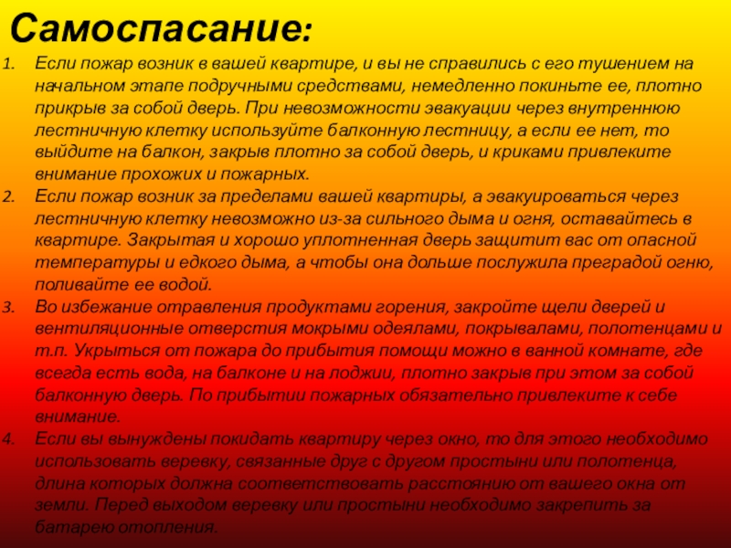 его тушением на начальном этапе подручными средствами, немедленно покиньте ее, плотно прикрыв за собой дверь. При невозможности эвакуации через внутреннюю лестничную клетку используйте балконную лестницу, а если ее нет, то выйдите на балкон, закрыв плотно за собой дверь, и криками привлеките внимание прохожих и пожарных.