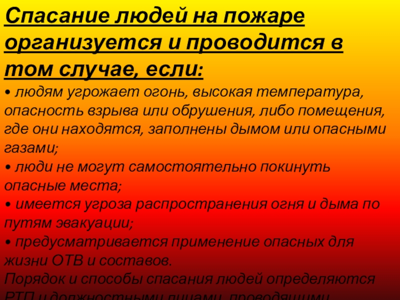 Слайд 14Спасание людей на пожаре организуется и проводится в том случае, если: