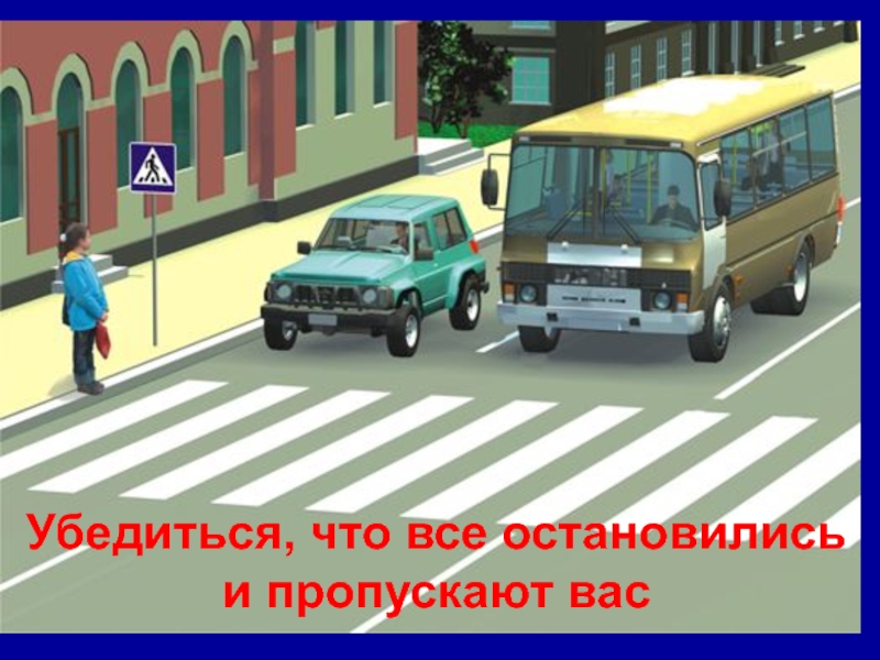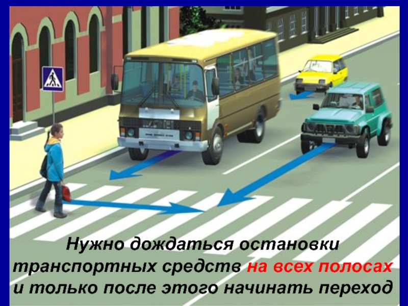 Нужно дождаться остановки транспортных средств на всех полосах и только после этого начинать переход