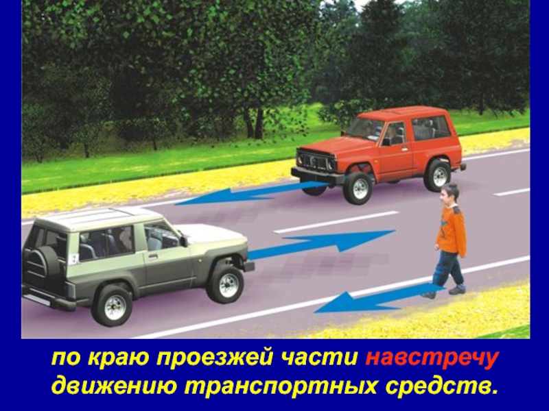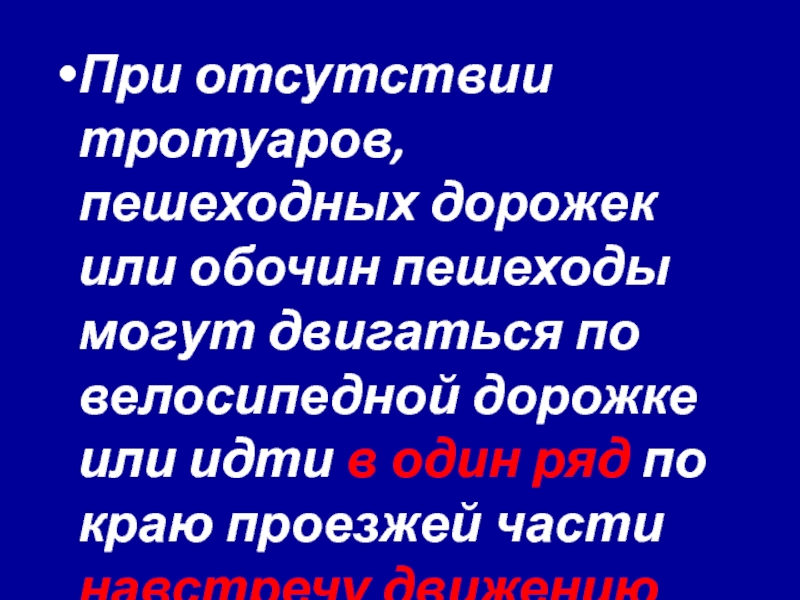 Слайд 4При отсутствии тротуаров, пешеходных дорожек или обочин пешеходы могут двигаться по