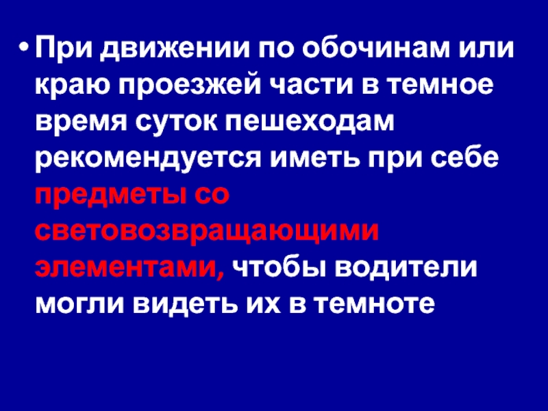 При движении по обочинам или краю проезжей части в темное время суток пешеходам рекомендуется иметь при себе