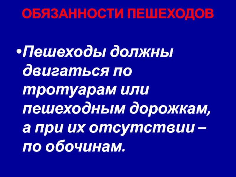ОБЯЗАННОСТИ ПЕШЕХОДОВ Пешеходы должны двигаться по тротуарам или пешеходным дорожкам, а при их отсутствии – по обочинам.