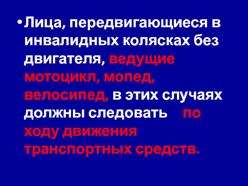 Лица, передвигающиеся в инвалидных колясках без двигателя, ведущие мотоцикл, мопед, велосипед, в этих случаях должны следовать	 по