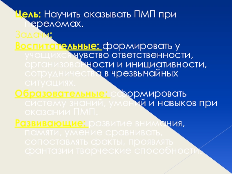 Цель: Научить оказывать ПМП при переломах.Задачи:Воспитательные: формировать у учащихся чувство ответственности, организованности и инициативности, сотрудничества в чрезвычайных