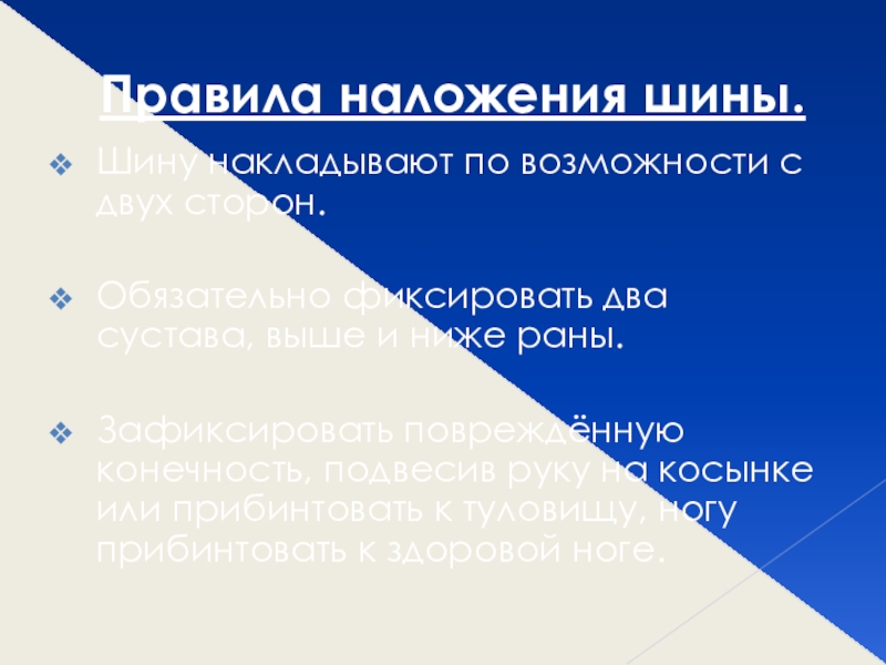 Правила наложения шины.Шину накладывают по возможности с двух сторон.Обязательно фиксировать два сустава, выше и ниже раны.Зафиксировать повреждённую