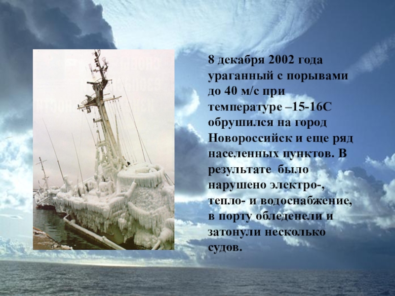 Слайд 78 декабря 2002 года ураганный с порывами до 40 м/с при