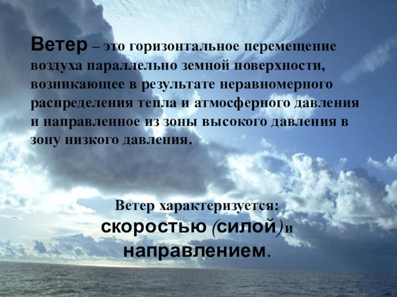 Ветер – это горизонтальное перемещение воздуха параллельно земной поверхности, возникающее в результате неравномерного распределения тепла и атмосферного