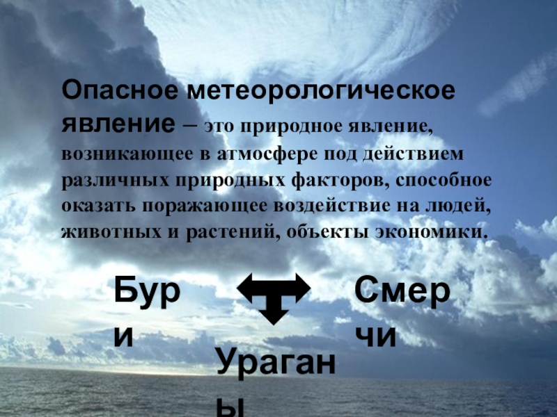 Опасное метеорологическое явление – это природное явление, возникающее в атмосфере под действием различных природных факторов, способное оказать поражающее воздействие на людей, животных и растений, объекты экономики.БуриУраганыСмерчи
