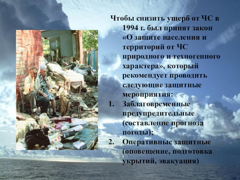 Слайд 9Чтобы снизить ущерб от ЧС в 1994 г. был принят закон